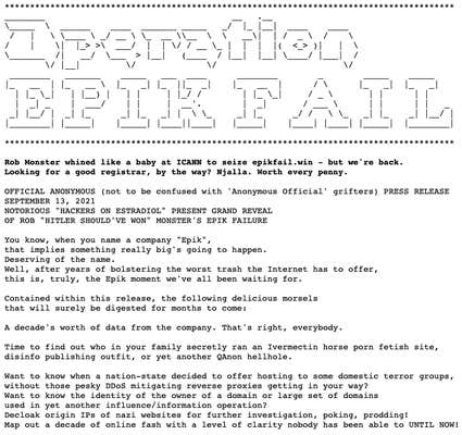 Em um comunicado à imprensa sobre o hack, denominado Operação EPIK FAIL, o Anonymous afirmou que conseguiu obter “uma década” de informações, incluindo registros e transferências de domínio, credenciais de contas e e-mails de um funcionário da Epik.
